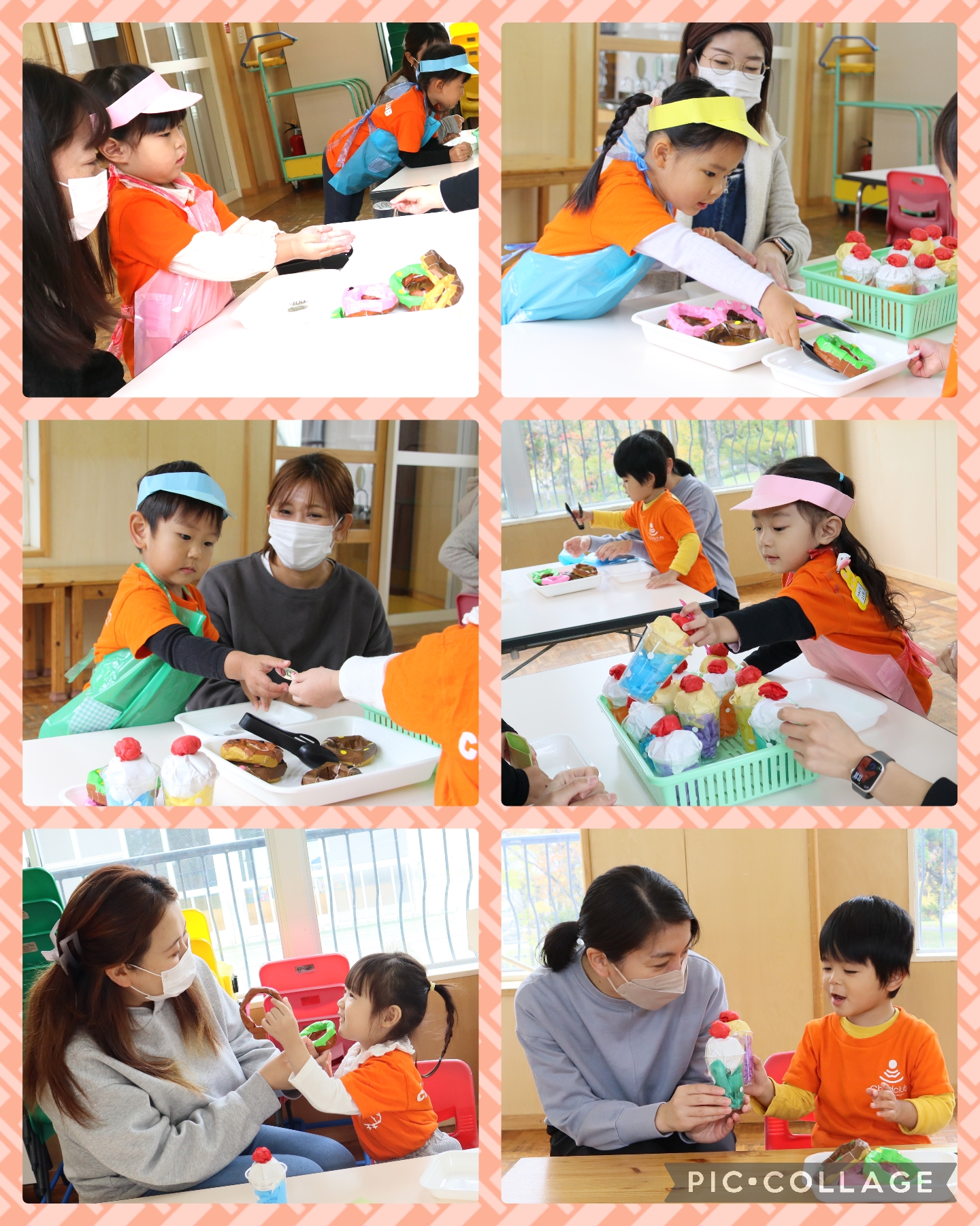 前回の保育で作った『ドーナツ』と『クリームソーダ』を使って、お店屋さんごっこをしました‼️