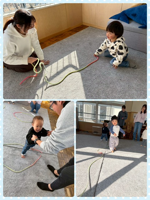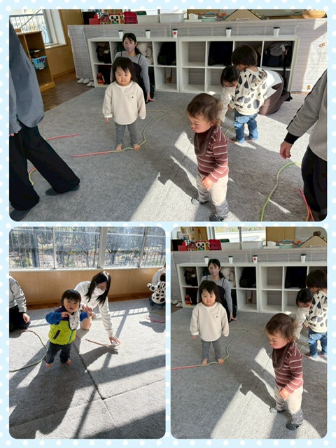 縄の上を落ちない様にバランスを取りながら歩いてみたり、縄で円を作ってジャンプしたり身体を動かしながら楽しんでいました👏